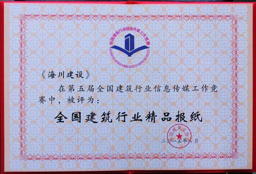 8月26日,中國建筑業(yè)協(xié)會(huì)在大連召開的全國建筑行業(yè)信息傳媒工作經(jīng)驗(yàn)交流會(huì)上,向第五屆全國建筑行業(yè)信息傳媒工作競賽的優(yōu)勝者頒發(fā)了獎(jiǎng)杯和榮譽(yù)證書。海川集團(tuán)被評(píng)為“全國建筑行業(yè)信息宣傳先進(jìn)集體”,公司網(wǎng)站被評(píng)為“全國建筑行業(yè)精品網(wǎng)站”,《海川建設(shè)》企業(yè)報(bào)被評(píng)為“全國建筑行業(yè)精品報(bào)紙”,王修岐同志被評(píng)為“全國建筑行業(yè)信息宣傳優(yōu)秀工作者”。